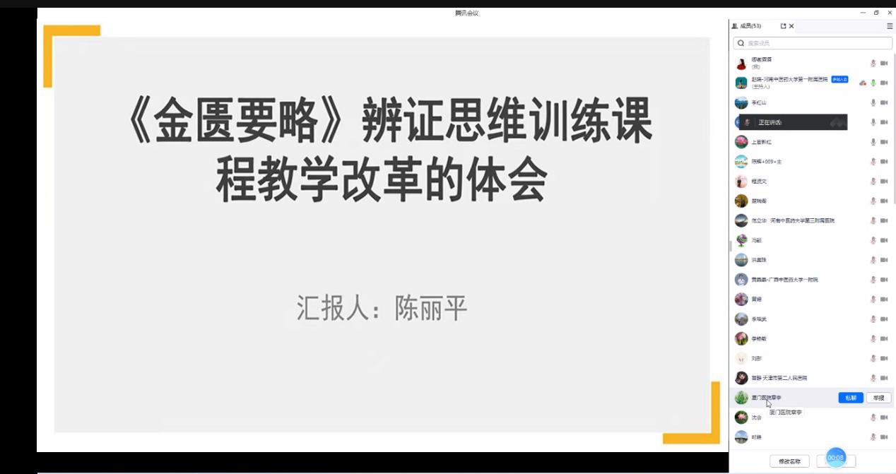 为了充分发挥优秀教师在提高教师队伍素质中的引领示范作用,进一步激发高校青年教师更新教学理念、更新现代教学方法的热情,推动虚拟教研室教师教学质量的全面提升。特邀请陈丽平副教授开展《金匮要略》辨证思维训练课程教学改革分享会,会议在线上举行,教研室全体同仁参加了会议。